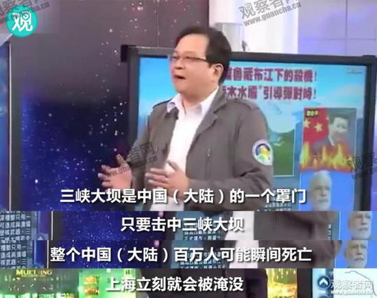 观察者网小编查询发现,这段视频来自台湾政论节目《关键时刻》,台湾名嘴黄创夏在节目中大放厥词:“三峡大坝是中国(大陆)的一个罩门,只要击中三峡大坝,整个中国(大陆)百万人可能瞬间死亡,上海立刻就会被淹没。”