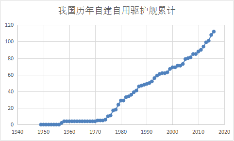 我国历年自行建造并在人民海军中服役的驱逐舰(destroyer)和护卫舰(frigate,不含轻型护卫舰/corvette)累计艘数的统计图