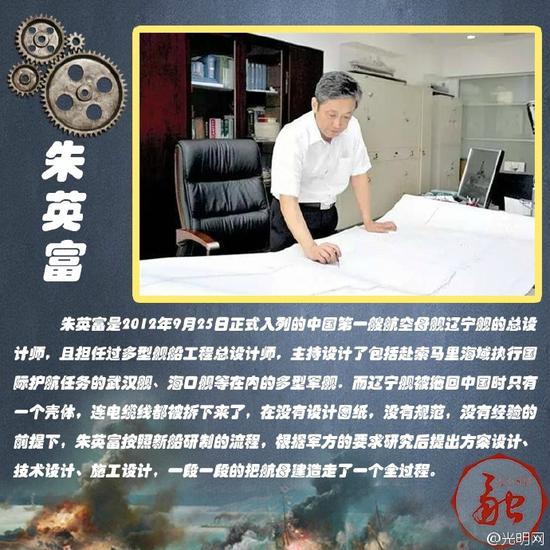 朱英富是中国着名舰艇设计及造船专家,中国海军国防中多种现代化舰艇的总设计师,包括新近下水引起世界关注的辽宁号航空母舰。