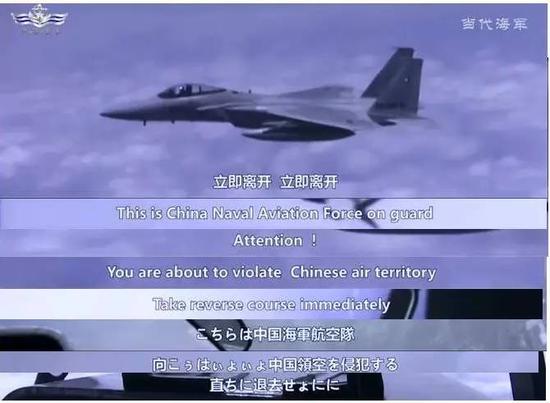 一声令下,战机起飞,“170发现目标”。海军飞行员分别使用汉语、英语和日语向日方战机喊话,“注意,我是中国航空兵,你即将进入中国领空,立即离开,立即离开”,声音沉稳连贯。