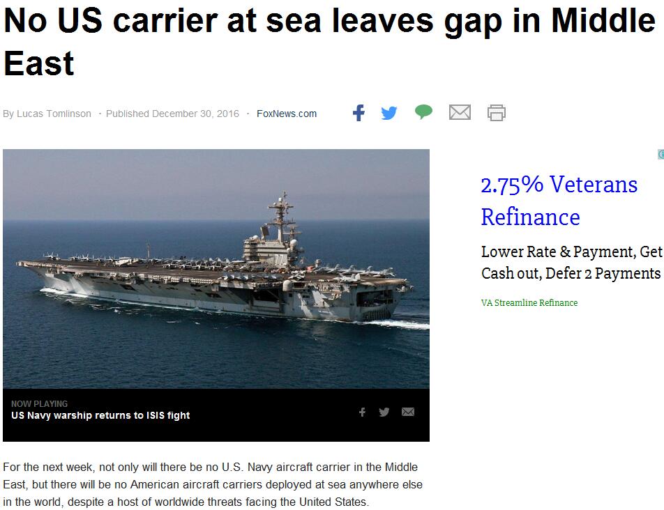 美国福克斯新闻网2016年12月30日报道称,随着在中东海域打击极端组织“伊斯兰国”(IS)的“艾森豪威尔”号航母返回美国本土,未来一周美国将撤回游弋在全球海域的所有航母群。这是二战以来首次全球海域中没有一艘美国航母游弋,值得外界关注。