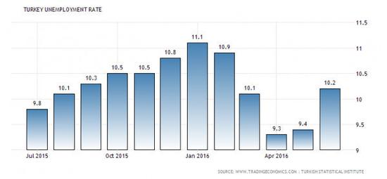 资料图:土耳其失业率(2015年7月至2016年6月,数据:TradingEconomics网站)