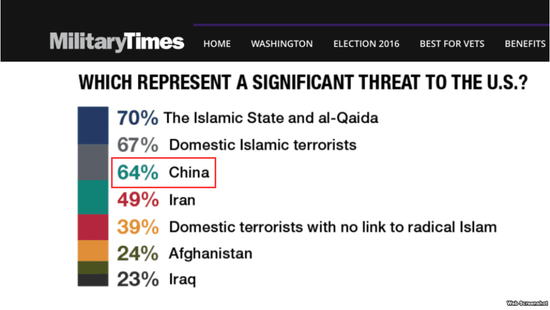 美国《军事时报》(Military Times) 1月8日公布了联合纽约州雪城大学(Syracuse University)在2016年12月对1600多名现役军人所做的民意调查。其中,约70%的受访者认为伊斯兰国等恐怖组织对美国安全构成重大威胁,有59%的受访军人认为从伊拉克撤兵让美国缺乏安全感,64%的受访者认为总统缺乏对国家安全最大威胁的关注。而中国对美国国家安全构成重大威胁,这个数据远远高出认为其他国家对美国安全构成重大威胁的受访者比例。