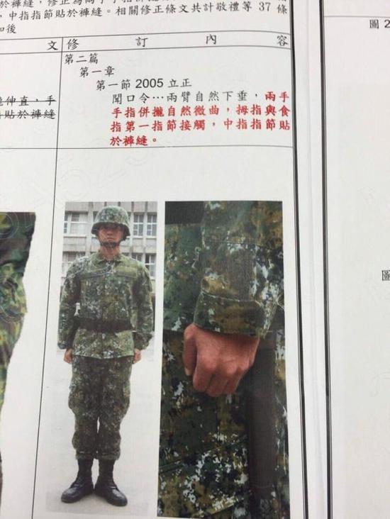 综合台媒1月10日报道,台湾防务部门研议要将已经施行13年之久的军人立正标准姿势进行修改,今后的立正姿势将从现行的“五指并拢伸直紧贴裤烽”改成“半握拳”,于1月16日起试行。台湾防务部门表示这是参考美日韩等国做法,主要强调手肘自然下垂,符合人体工学,执行上能彰显“国军”英挺气质。