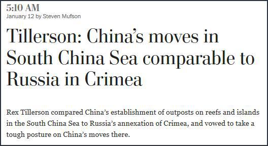 据华盛顿邮报1月12日报道,在听证会上,蒂勒森竟声称,中国在南海的造岛建礁行为犹如俄罗斯在克里米亚的行为,在南海的领土主张是“非法行为”。美国应该对此采取强硬的姿态。