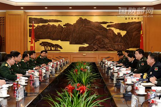 1月13日上午,国务委员兼国防部长常万全在八一大楼会见了随越共中央总书记阮富仲来访的越南国防部长吴春历。李晓伟 摄