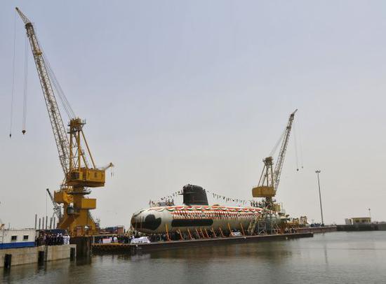 资料图片:2015年4月6日,在印度孟买,印度第一艘“鲉鱼”级潜艇准备下水。