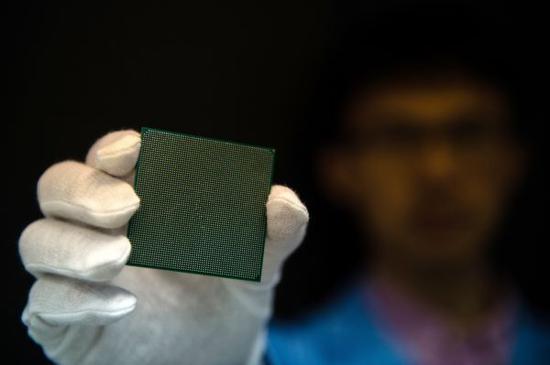 一名研发工程师展示“神威太湖之光”所使用的“申威26010”众核处理器。