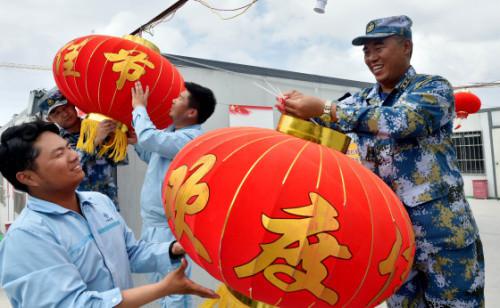 2016年春节,南沙美济礁建设者和官兵一起悬挂红灯笼。(资料图片)
