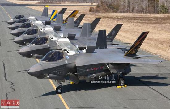 资料图:进行集体地面展示的F-35B(近处4架)和F-35C(最远2架)战机。