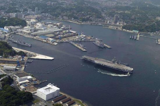 当年“小鹰”号航空母舰被拖轮顶出横须贺码头的情景