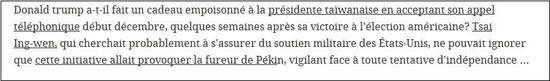 先留给台湾一点反应时间,让我们来看一篇昨天的法媒报道——特朗普上任前接听蔡英文的那通电话,会不会是一个“有毒的礼物”?