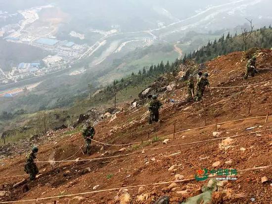 雷场地形复杂,有时扫雷官兵需要拽着绳子等东西保持平衡。