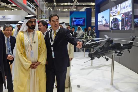 阿联酋首都阿布扎比,阿联酋副总统兼总理、迪拜酋长穆罕默德·本·拉希德·阿勒马克图姆(前左)参观中国防务展区
