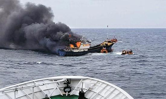 资料图:一艘中国渔船在全罗南道新安郡红岛附近海域被韩国海警投出的爆音弹击中,图为船只起火后正冒出一股黑烟。