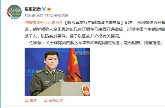 #国防部例行记者会# 【解放军增兵中朝边境纯属捏造】记者:香港媒体近日报道,朝鲜领导人金正恩的长兄金正男在马来西亚遇害后,近期中国向中朝边境增派千人,以防突发事件。请予以证实并介绍有关情况。