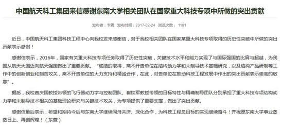 感谢信表示,2016年,国家有关重大科技专项任务取得了历史性突破,关键技术水平和能力实现了与国际强国的比肩与超越,为我国从航天大国迈向航天强国做出了重要贡献。“成绩的取得,离不开贵单位在结构动力学和末制导技术基础研究,以及结构产品研制等工作中的创新创业和刻苦攻关,离不开贵单位的大力支持和精诚合作,在此,对贵单位在推动科技工程发展中作出的突出贡献表示崇高的敬意”。