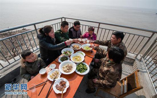 王志国(左三)和姐姐一家在开山岛上和父母团聚(2015年2月13日摄)。边防干警王志国是王继才夫妇的儿子,由于要在连云港灌南边防大队值哨,无法在除夕夜和家人团聚,因此,他提前来到开山岛,陪父母巡岛,和家人提前团聚。