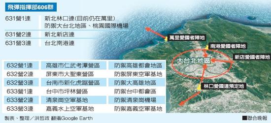 据报道,台防空导弹指挥部目前辖有3个导弹群,下设多个导弹营,防空导弹指挥部有“爱国者3型”、“鹰式导弹”等防空导弹,并有一定数量战术反制导弹及“雄二E巡航导弹”。