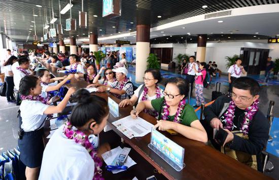 长乐公主号邮轮西沙首航。2017年3月2日,首批游客正在办理登船手续。新华社记者郭程摄