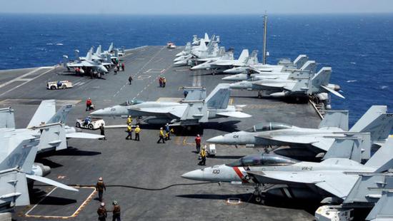 在美国驻菲律宾大使金成陪同下,菲律宾国防部长等官员观看了美军F-18战斗机起飞训练并会晤了舰上的美军将领。舰队指挥官其尔比表示,在南海巡航是要保障海空航道自由,“我们将继续让我们的盟友放心,继续用行动展示任何人都可以在国际水域航行。”