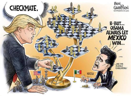 目前美国民众对特朗普的评价非常极端化,这幅漫画里,特朗普用“立体象棋”把墨西哥逼得无路可走,图中墨西哥总统涅托对表情绝望地抱怨:“奥巴马总是让墨西哥赢!”可见被媒体广为指责的对墨西哥的强硬政策其实为特朗普赢得了不少保守派的支持