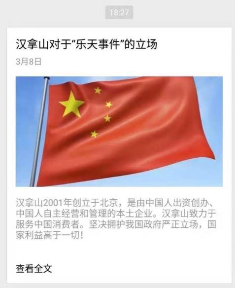 昨天(3月8日)晚间,以号称引领国内韩餐时尚,经营韩式烤肉、韩式拌饭等韩餐系列知名,在北京等地开有多家连锁店的餐饮企业汉拿山在其微信公众号中发布澄清声明表示:“汉拿山于2001年创立于北京,是由中国人出资创办,是百分百中资企业。未使用和销售过乐天产品,未来也坚决不会使用。”