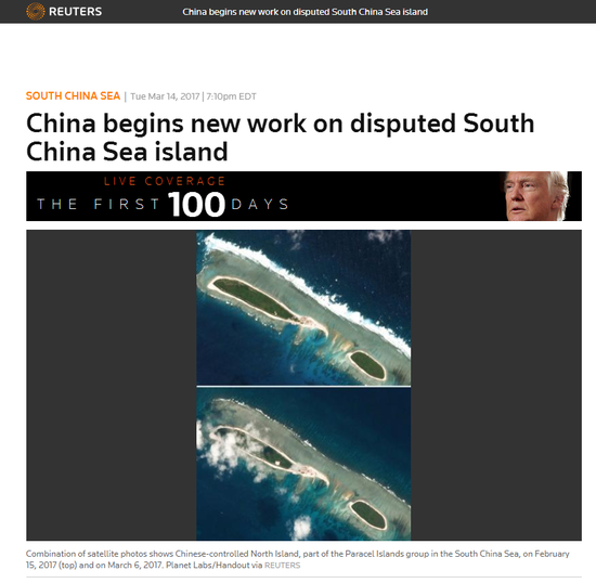路透社3月14日发布一条“耸动”消息,宣称最新卫星图像显示,中国已在南海西沙群岛开展新的建设工程,并称此举显示出,中国“持续加强在重要贸易航道的军事影响力”。
