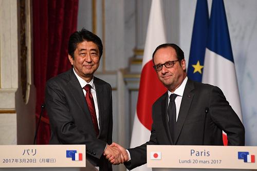 奥朗德(右)和安倍20日在爱丽舍宫出席记者会(法新社)
