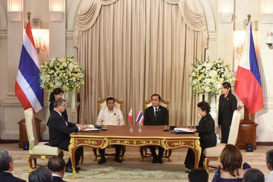 3月21日,泰国总理巴育与正在泰国进行国事访问的菲律宾总统杜特尔特举行会晤,双方强调全面有效执行《南海各方行为宣言》的必要性,承诺致力于推动“南海行为准则”框架于年内完成。新华社记者李芒茫摄