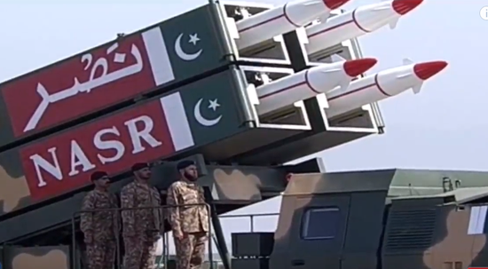 这是巴基斯坦于2011年首次试射的NASR近程弹道导弹,也就是坊间传闻的“哈塔夫-9”。该统使用四联装方形发射箱,有效射程不到100公里,在使用和定位上类似苏联9K52战术火箭或9K79近程地地战术弹道导弹系统,主要用于前线陆军应对印度的“冷启动”战略(前置部署),可以携带核弹头。该系统的发射车可能类似于经典的中国万山WS2400型8×8特种越野车。