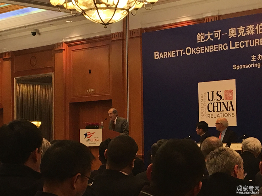 威廉·佩里:非常荣幸参加《鲍大可-奥克森伯格中美关系讲座》。我听到现在有很多人都认为,民主制度已经变得不再那么有效了。我知道现在民主制度在全球都面对着挑战,比如说美国的选举民粹化、英国的脱欧公投和韩国所面临的核危机。但我始终认为,民主制度的生命力依然强大。美国依然是民主制度及人民的堡垒。有人说,苏联的存在曾经挑战了美国的民主制度。我得说,苏联最后失败了。苏联的失败在于它们的制度在文化上并不鼓励人民思考、在经济上也不奖励创新,因此苏联最后失败了。