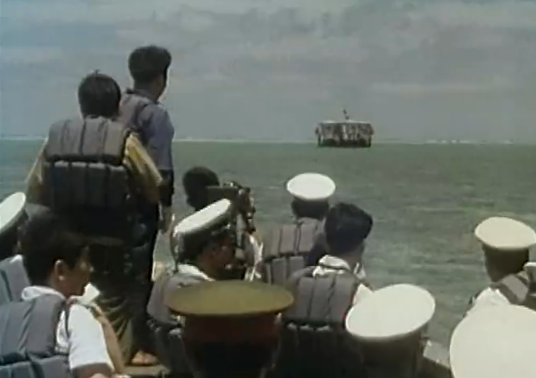 1988年前往赤瓜礁报道的记者们,还需要穿着救生衣搭载渔船“漂”上铁皮高脚屋。事实上,这已经是第二代高脚屋了,第一代高脚屋只是土木结构的窝棚。