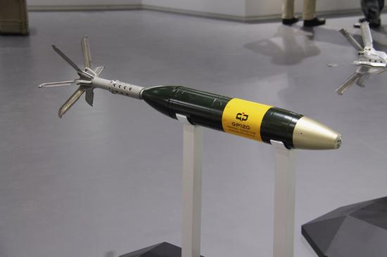 GP120A型(也称GP9)制导迫击炮弹同样采取半主动激光制导,通过前部的四个鸭式舵控制翼面来实现飞行姿态调整和末修正。该弹口径120mm、长980mm、重20kg,最小射程2km、最大射程7.5km。该弹可以攻击移动目标,当目标位移速度小于36km/h时,命中率超过90%。