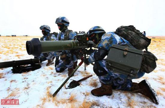 资料图:海军陆战队员在雪地里进行反坦克火箭操作使用训练。新华社记者 查春明 摄