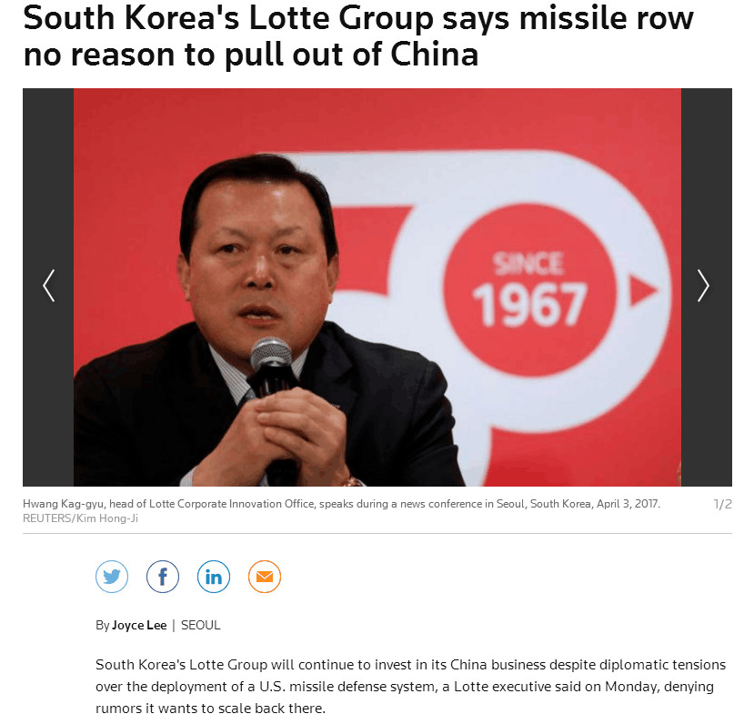 据英国路透社4月3日报道,乐天集团3日表示,尽管“萨德”换地问题给乐天集团在华业务发展造成严峻挑战,但缩减在华投资是谣言,乐天集团将继续投资在华业务。