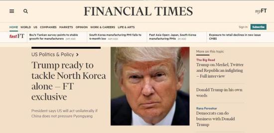 4月2日,英国《金融时报》网站刊载题为《特朗普准备单独对朝鲜采取行动:总统称如果中国不对朝鲜施压,美国将单方面采取行动》的专访。