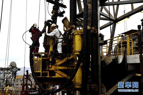 “决心”号钻探工人在钻探平台上工作(4月1日摄)。新华社记者 张建松 摄