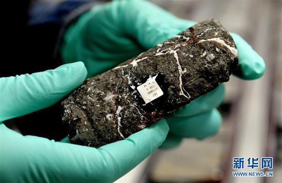 “决心”号在U1500B孔钻取得的南海海底玄武岩(4月2日摄)。新华社记者 张建松 摄