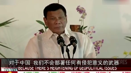 谈及已下令派出军队占领南沙岛礁一事,杜特尔特称,“我们不会(在菲实控岛屿上)部署攻击性武器,甚至一把枪也不会,我们并无意伤害中国,我们和中国是朋友。”