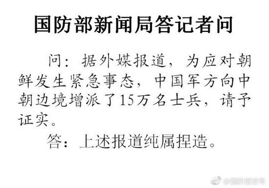 问:据外媒报道,为应对朝鲜发生紧急事态,中国军方向中朝边境增派了15万名士兵,请予证实。