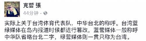 “实际上关于台湾体育代表队、‘中华台北’的称呼,台湾蓝绿媒体在岛内报道时都进行篡改。”一位网友在脸书总结道,“蓝营媒体一般称呼‘中华队’,省略‘台北’两字,绿营则一贯只称为‘台湾’。”