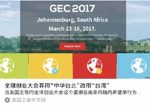 两个月后,据“美国之音”中文网报道,由美国主导的全球创业大会首次用“台湾”而不是过去的“中华台北”来称呼台湾代表团。