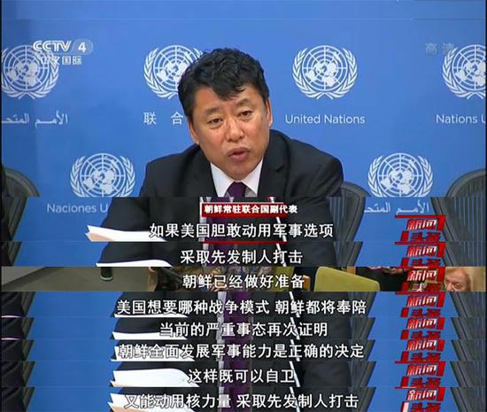 朝鲜常驻联合国副代表金利龙(音)神情严肃,一字一句地声明,“无论美国想要哪种战争模式,朝鲜都将奉陪”。