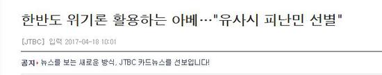 韩国JTBC电视台18日指出,日本连日来过分强调朝鲜威胁和不安,甚至开始讨论半岛发生不测事态时如何保护难民的政策,“安倍看样子正露骨地将所谓的‘半岛危机’用于国内政治”。