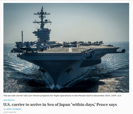 军事:美国副总统彭斯发话称卡尔文森号月底前日本海就位