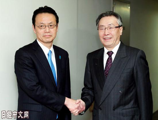 武大伟(右)与金杉宪治在日本外务省进行会谈
