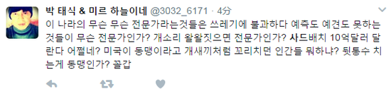 推文:不能容忍“萨德”,更不能容忍这样的偷盗行为和流氓行为!竟然将我们的土地非法让给美国。之前说好了要走完该走的程序,结果就这样食言?是看现在就要下台了,赶紧先做了赌一把是吧?必须问责!
