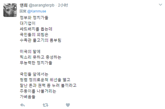 推文:政府、政治家和大企业为“萨德”部署提供帮助,而国民的呼声就像是水族馆里鱼儿们的挣扎。那些对美国一声都不敢吭的无能的政治家们,只会在国民面前装出一副清廉正义的样子。