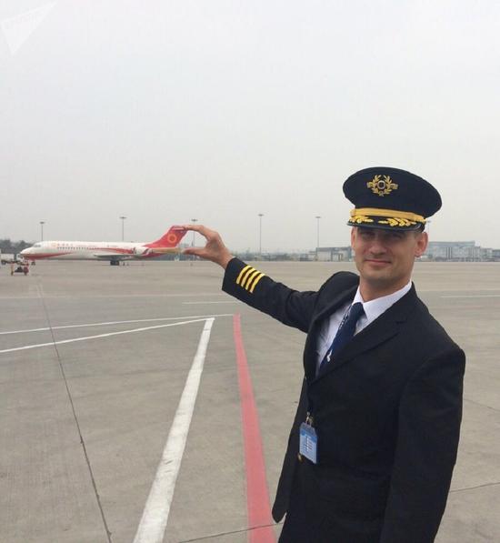 德米特里·拉达耶夫,照片背景为成航的ARJ-21
